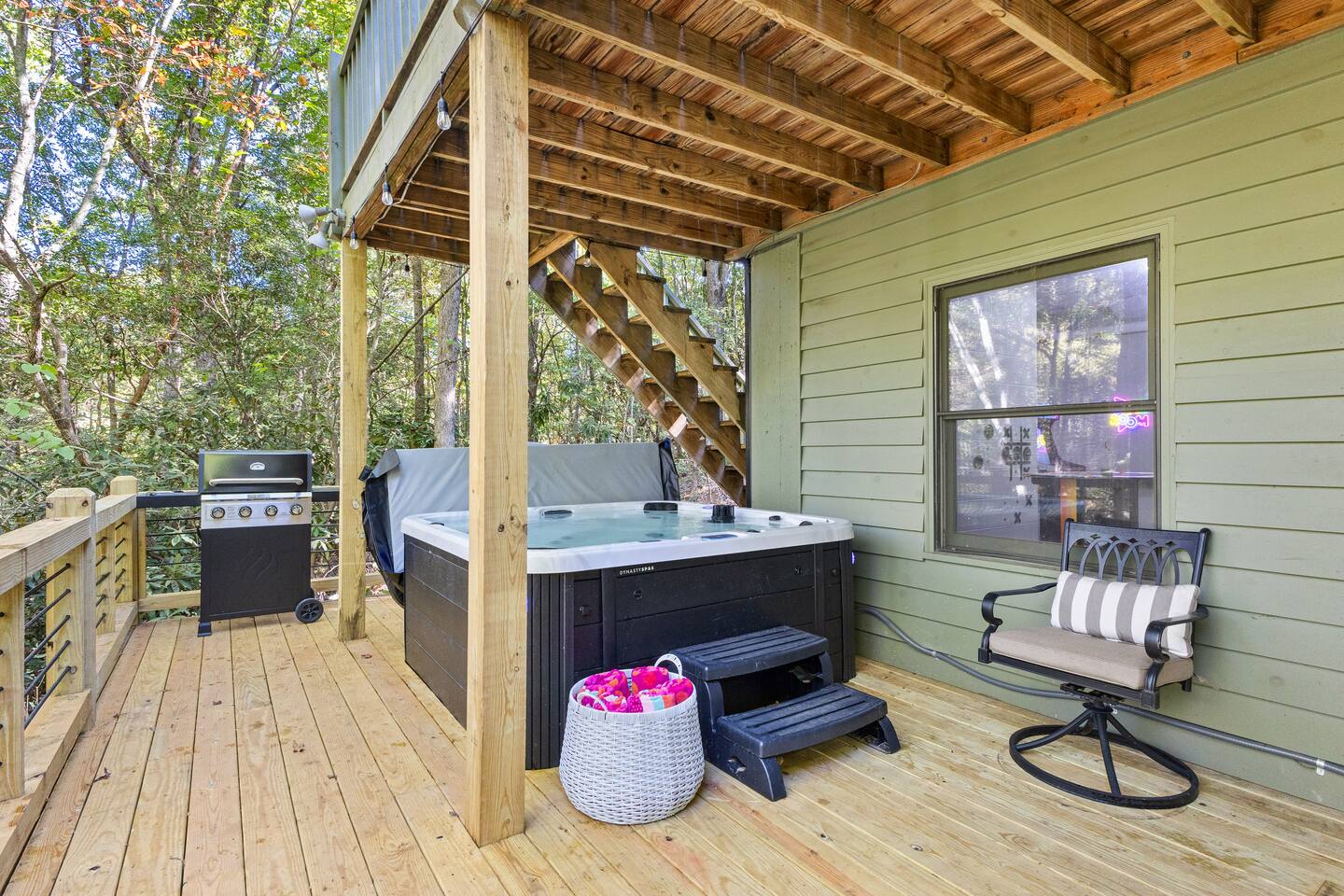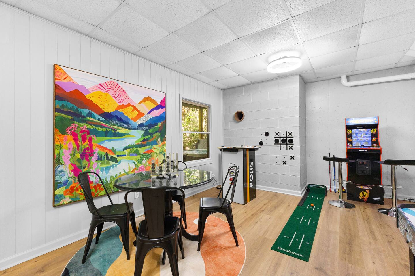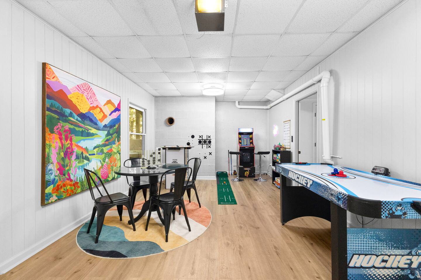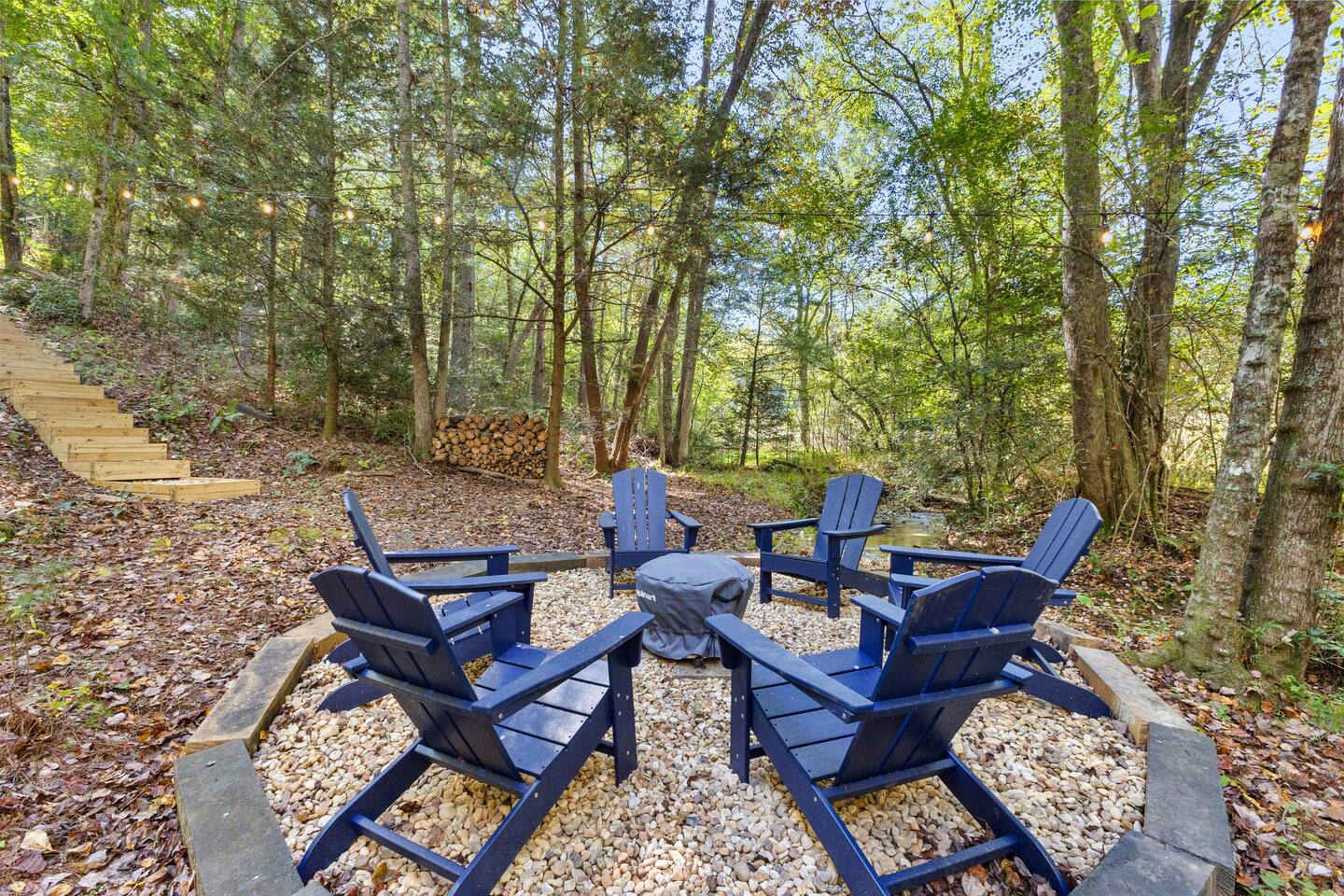 ✔ Cabin sits on 1.5 acres with Kyle creek (an off-shoot of the Toccoa) running along the expansive backyard ✔ Hot tub, game room with arcades, and firepit are a few of the amenities ✔ Bedrooms have well-rated mattresses/pads, ceiling fans, and sound machines ✔ High speed wifi ✔ Smart Roku TVs in living room, primary bedroom, and basement bedroom. Bring your own log-ins! ✔ Well appointed kitchen with stainless steel appliances, trash compactor, air fryer, coffee maker, blender, and toaster. ✔ Highchair, pack n play, sippy cups, and a few toys for little ones